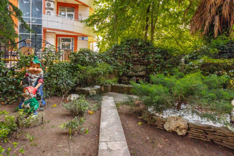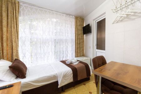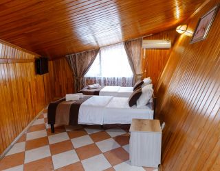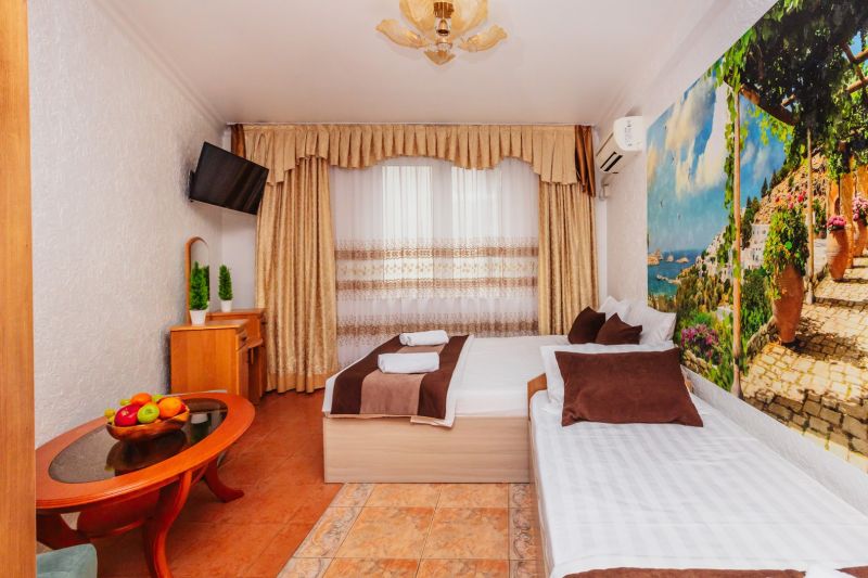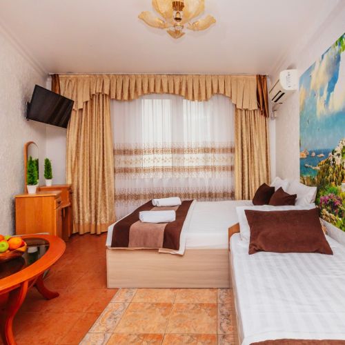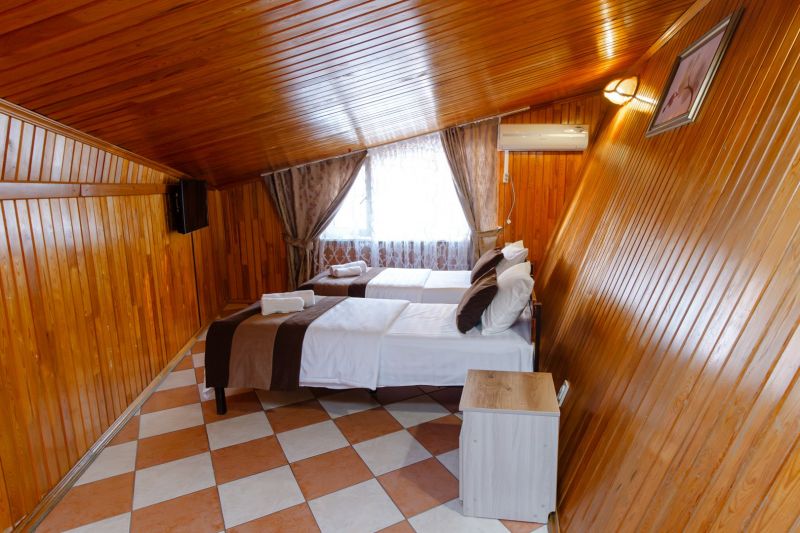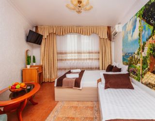 Номера выполнены в классическом стиле и расположены в трехэтажном строении с мансардой. В каждом номере есть набор необходимой удобной мебели, кондиционер, холодильник, телевизор ЖК.
