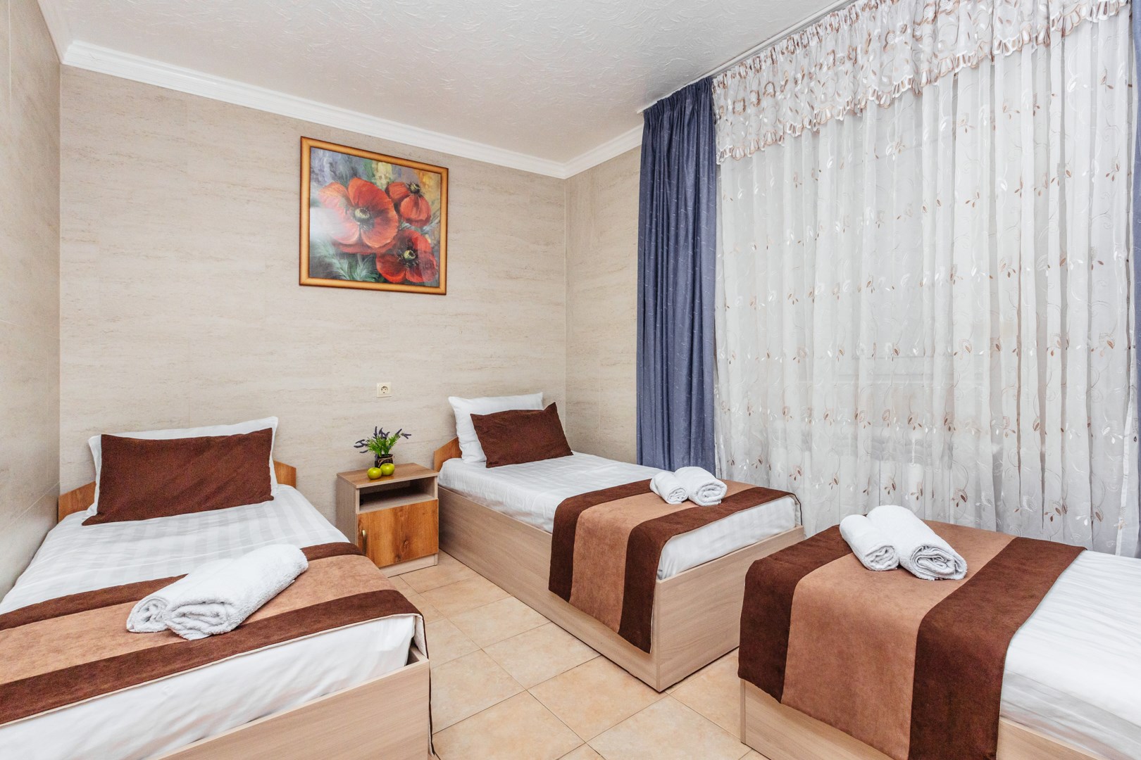 - Мебель: кровати односпальные, кровати односпальные /одна двуспальная кровать, прикроватные тумбочки, стол, стулья, шкаф