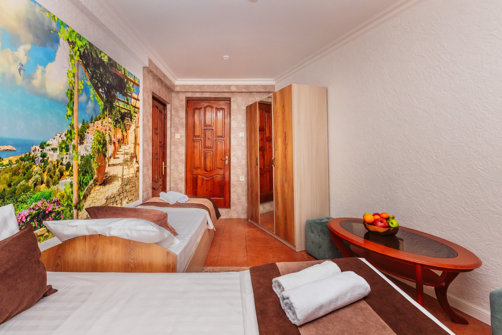 - Мебель: кровать двуспальная, кровать односпальная, прикроватная тумбочка, стол, стулья, шкаф